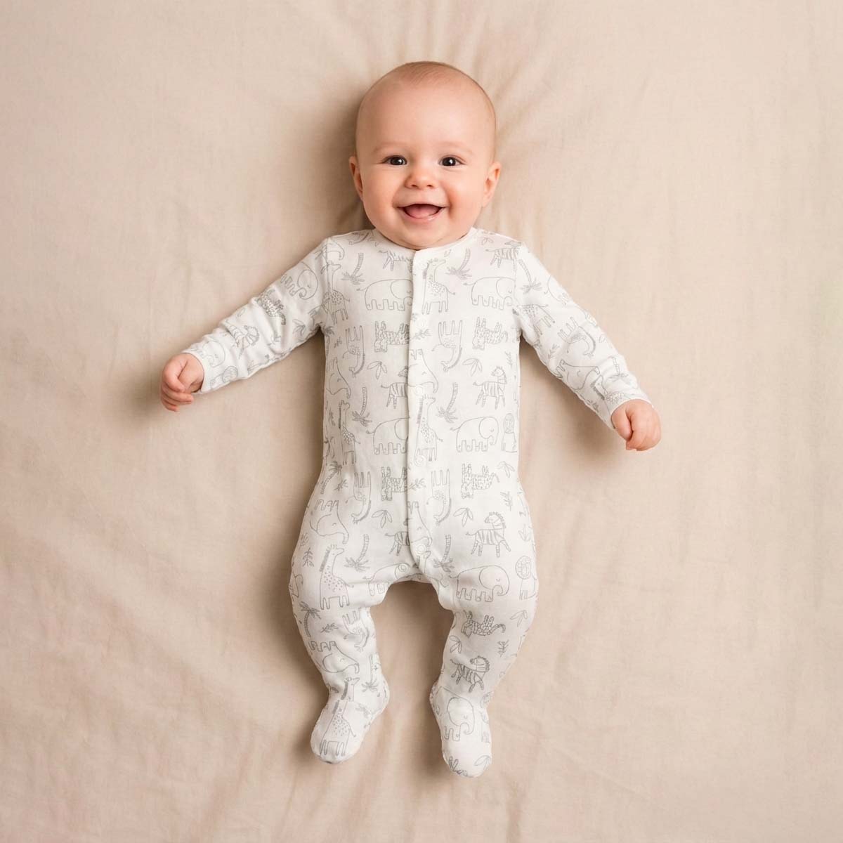 Perfect for newborn essentials, hospital bags, or thoughtful baby gifts, this baby safari animal sleepsuit is a versatile wardrobe staple. Soft, soothing, and effortlessly charming, it combines comfort, simplicity, and gentle storytelling in one must-have sleepwear piece.