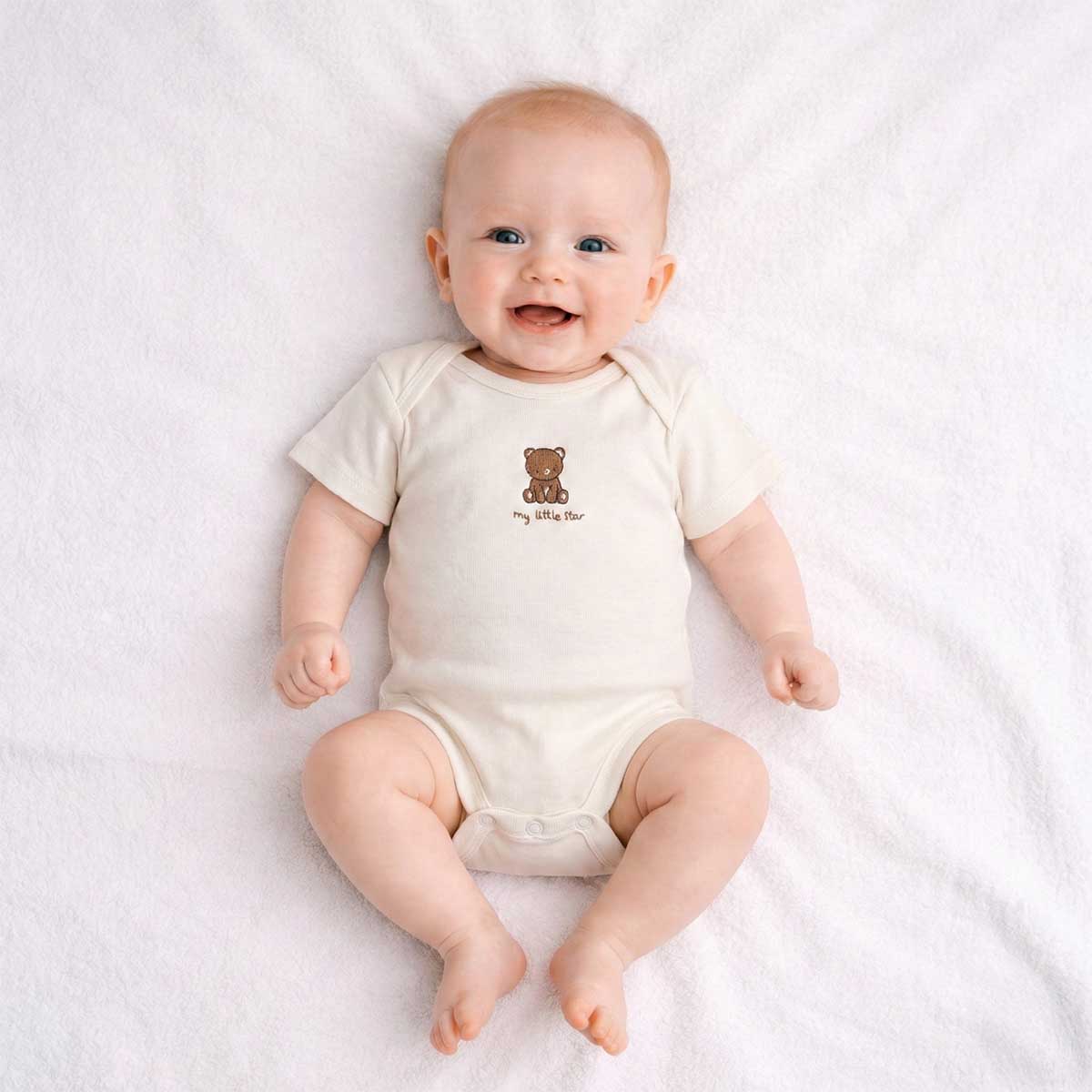 Baby teddy bear bodysuit designed to bring warmth, comfort, and gentle charm to your little one’s everyday wardrobe. Featuring an adorable teddy bear illustration with the sweet message “my little star,” this bodysuit captures a sense of love and tenderness that parents instantly connect with. The soft cream base keeps the look calm and timeless, making it a perfect choice for newborns and infants.