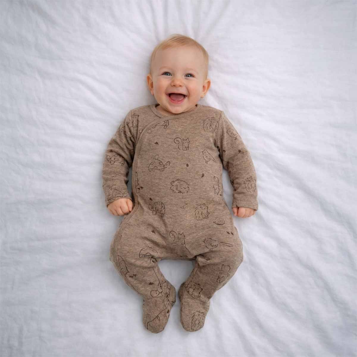 Baby woodland animal sleepsuit designed to bring warmth, comfort, and gentle charm to your baby’s everyday sleepwear. This sleepsuit features a beautiful all-over woodland animal print with hand-drawn style illustrations, including friendly lions, squirrels, birds, and other forest-inspired details. Set on a warm brown marl background, the design feels earthy, calming, and timeless—perfect for cozy naps and peaceful nights.