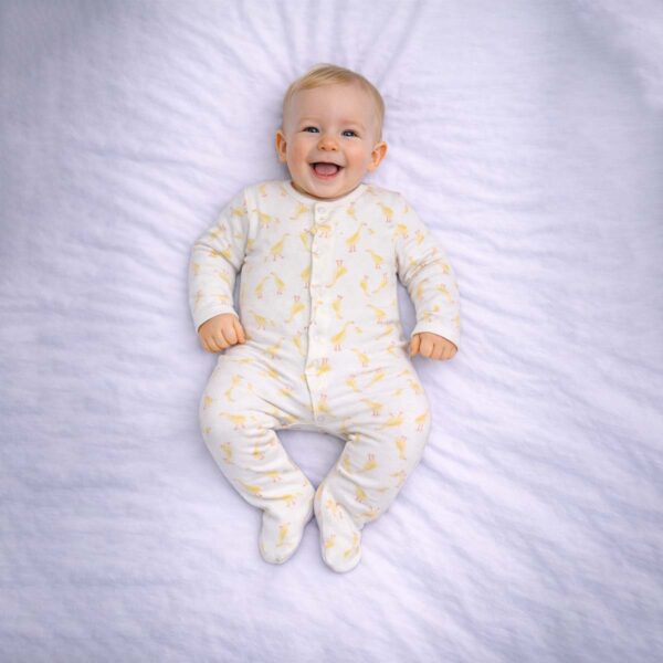 Duck Print Baby Sleepsuit designed to bring playful charm and gentle comfort to your baby’s everyday routine. This delightful sleepsuit features a sweet all-over duck print with soft yellow tones set against a clean white base, creating a cheerful yet calming look that feels perfect for newborns and growing babies. The light, whimsical design gives this duck print baby sleepsuit a fresh and joyful feel while remaining timeless and easy to style.