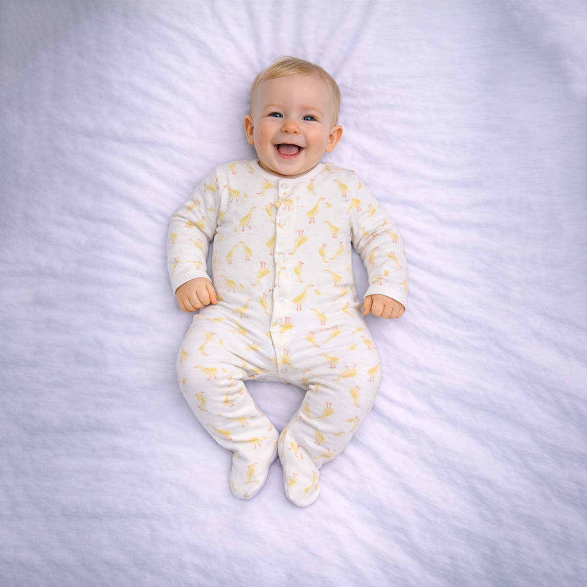 Blending softness, playfulness, and everyday practicality, the duck print baby sleepsuit is a must-have wardrobe essential parents will love reaching for again and again.