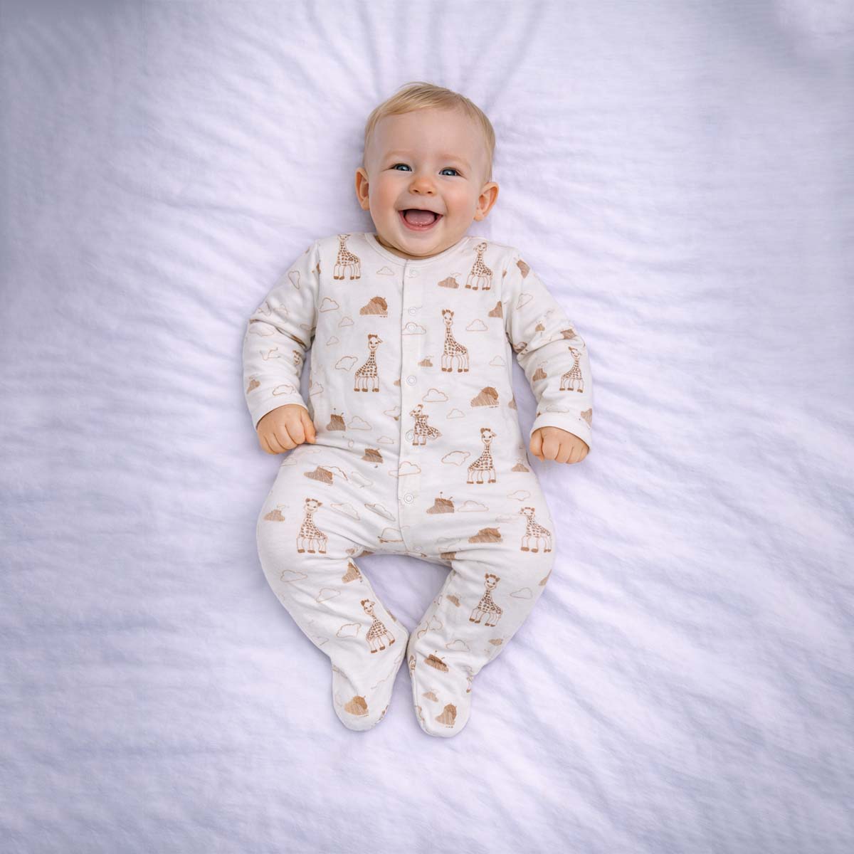 Made with a smooth and gentle fabric feel, this giraffe print baby sleepsuit is designed to keep delicate skin comfortable throughout naps, bedtime, and relaxed daytime moments. The soft texture allows easy movement, helping babies stretch, roll, and sleep peacefully without feeling restricted. Long sleeves provide cosy coverage, making it an ideal choice for day-to-night wear in any season.