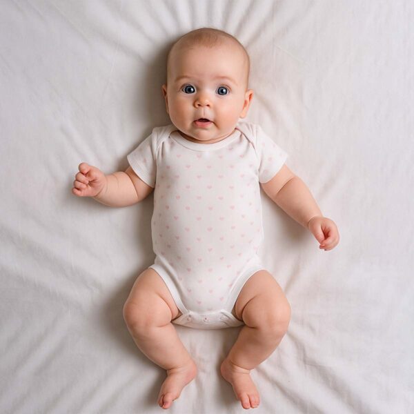 Dress your little one in sweetness and comfort with the Little Pink Hearts Baby Bodysuit. This adorable white bodysuit features a delicate all-over print of tiny pink hearts, creating a soft and charming look perfect for daily wear, naps, or layering.