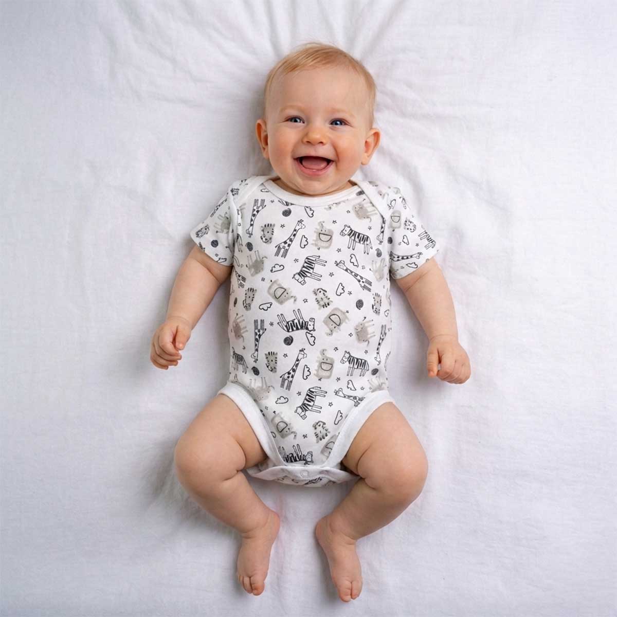 Crafted from soft breathable cotton with stretch fabric, this bodysuit feels smooth and gentle against delicate skin while allowing natural movement throughout the day. The short-sleeve design keeps your baby cool and comfortable, while envelope shoulders make dressing quick and fuss-free. A snap-button bottom closure ensures easy and stress-free diaper changes for parents.
