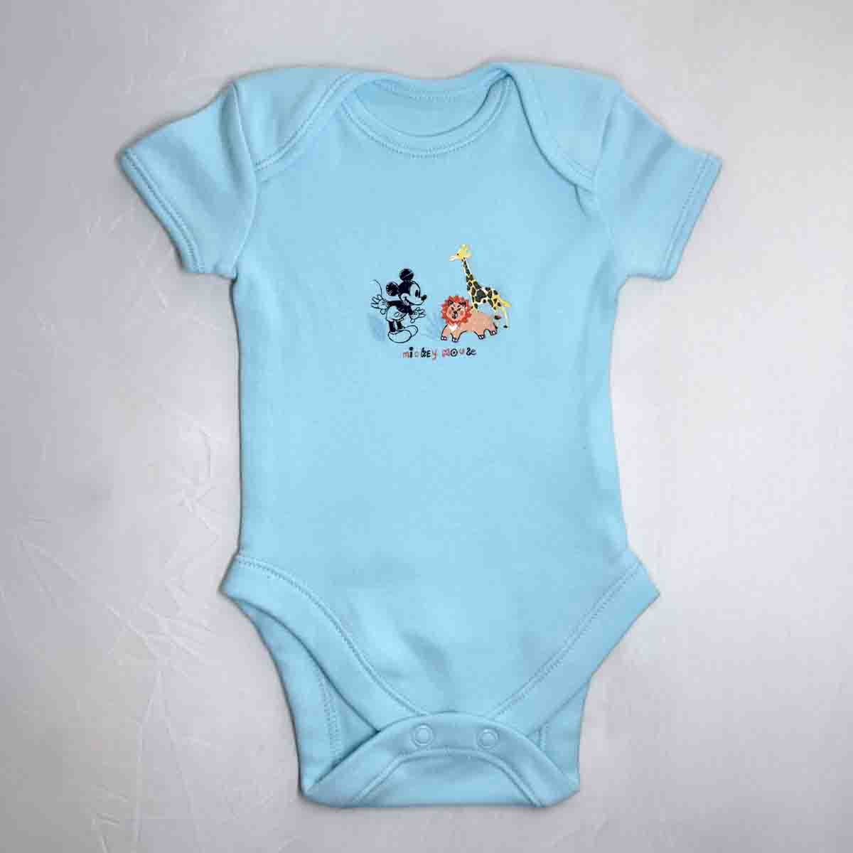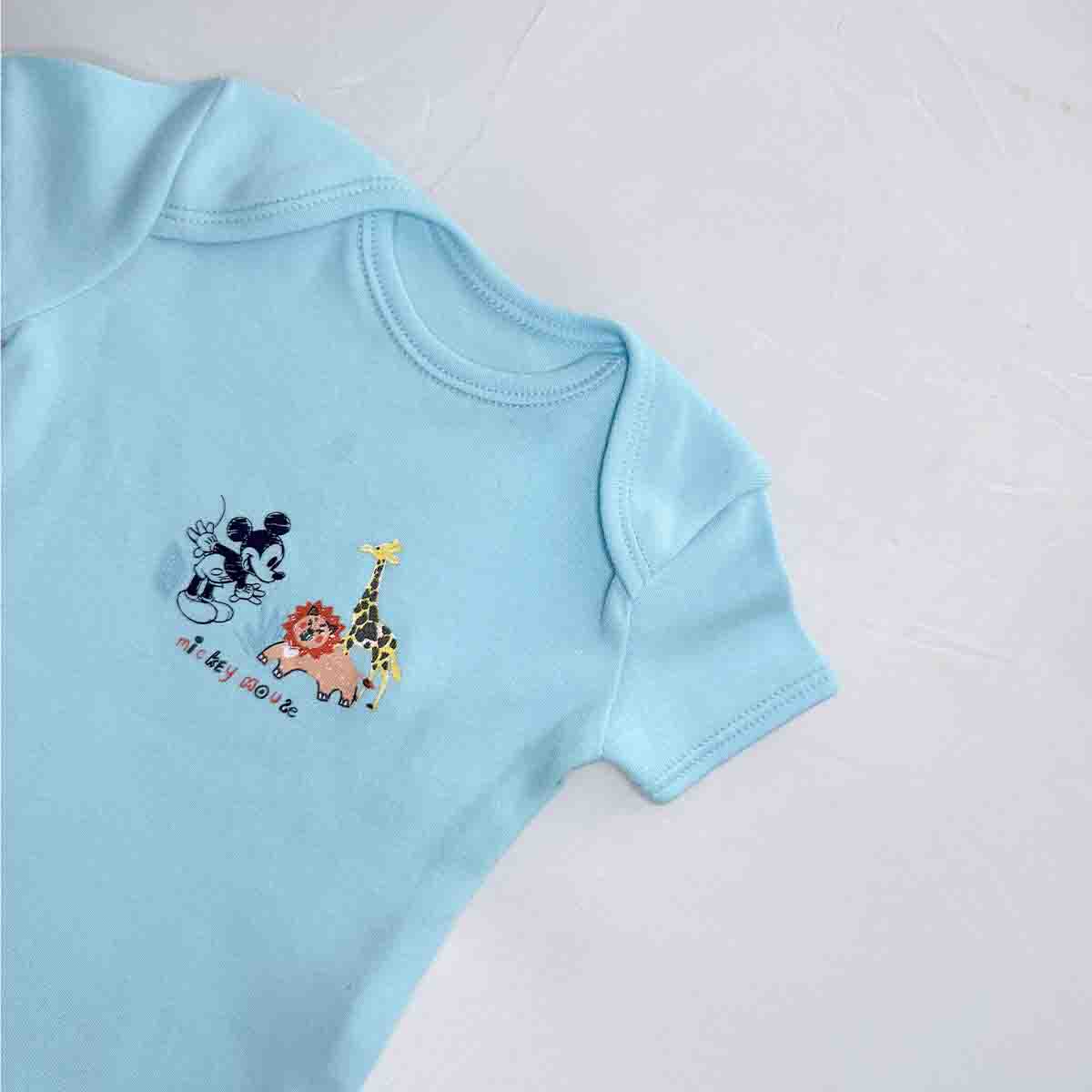 Playful and charming, the Mickey and Friends Adventure Baby Bodysuit features a soft sky-blue base with a delightful center graphic showcasing a friendly cartoon mouse alongside cheerful animal companions. The small, colorful illustration adds a fun storybook feel while keeping the overall look clean and minimal—perfect for everyday wear.
