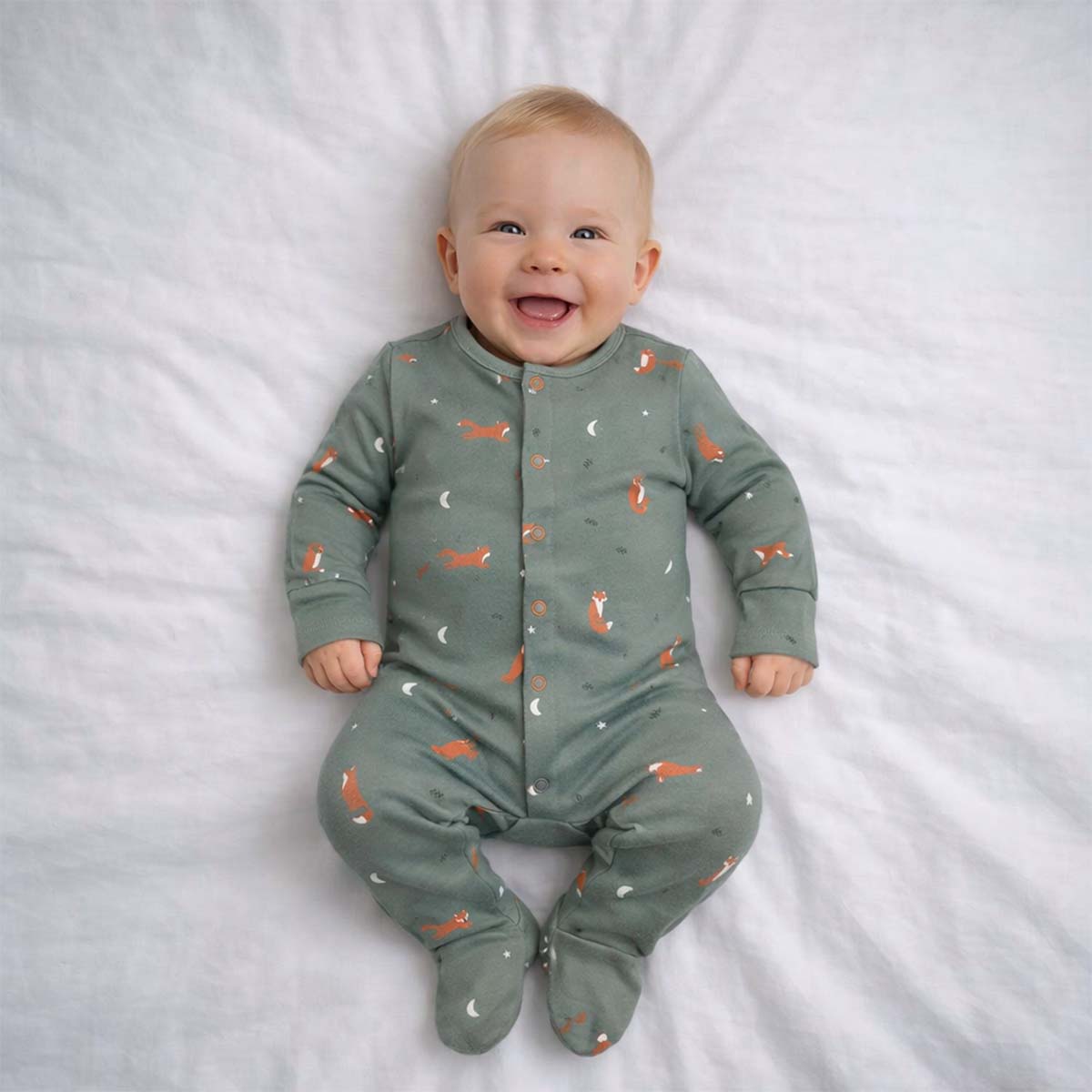 The Moonlit Fox Dreams Sleepsuit blends comfort, practicality, and gentle woodland charm, making it a beautiful everyday essential for your baby’s sleepwear collection.