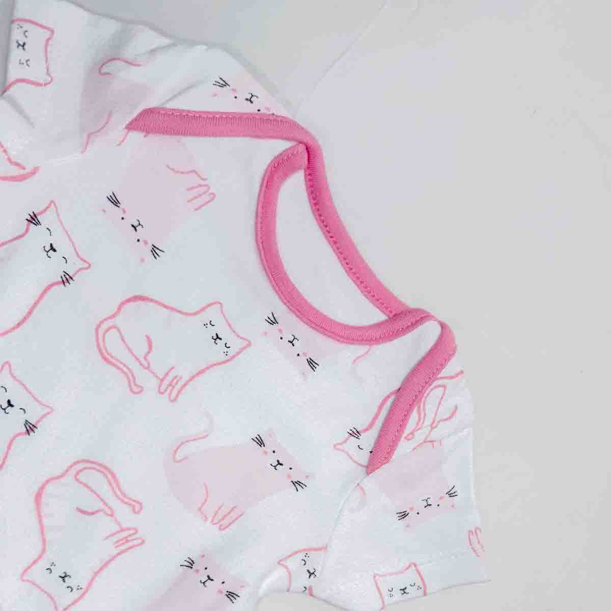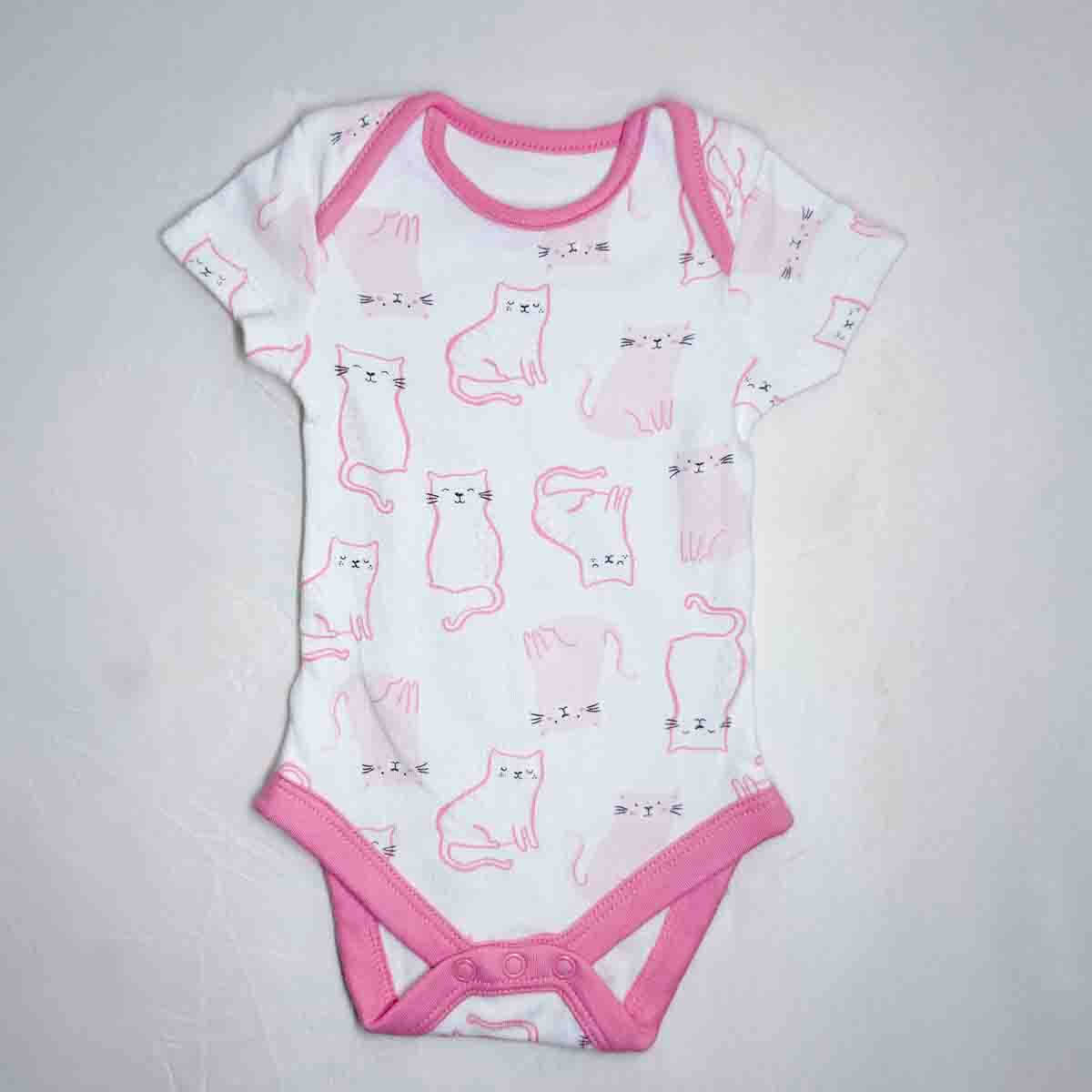 1 × Pink & White Cat-Print Cotton Baby Bodysuit (Short Sleeve)