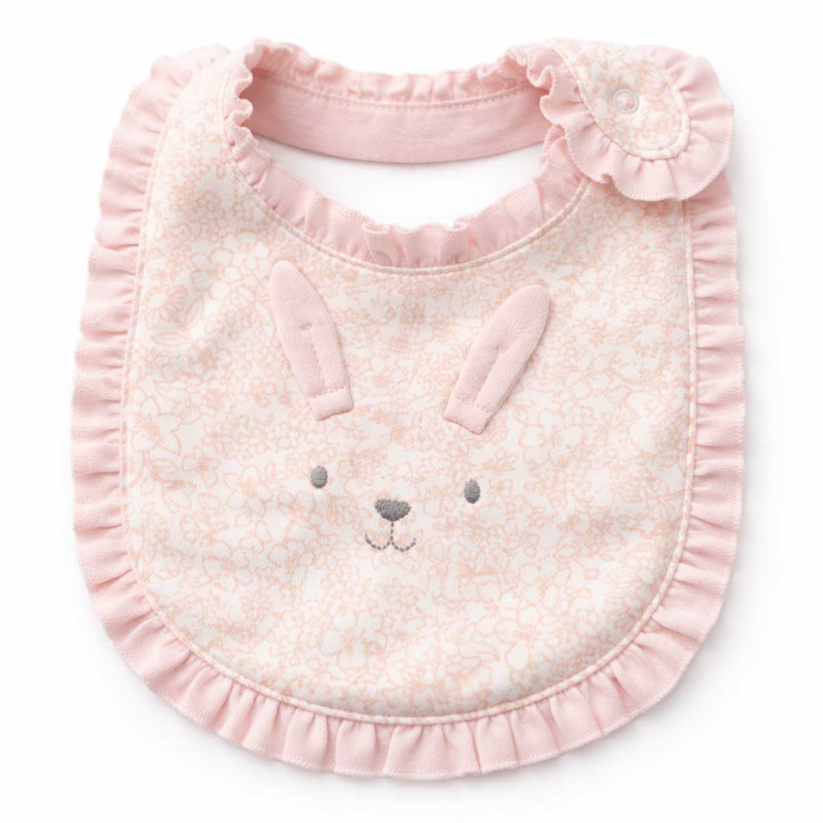Designed with parents in mind, this bib includes a simple snap closure at the shoulder for quick on-and-off changes. The soft pink palette pairs beautifully with a wide range of baby outfits, making it an easy choice for everyday wear or special outings. The subtle floral print and bunny detailing create a calm, sweet aesthetic that feels thoughtfully designed and gift-ready.