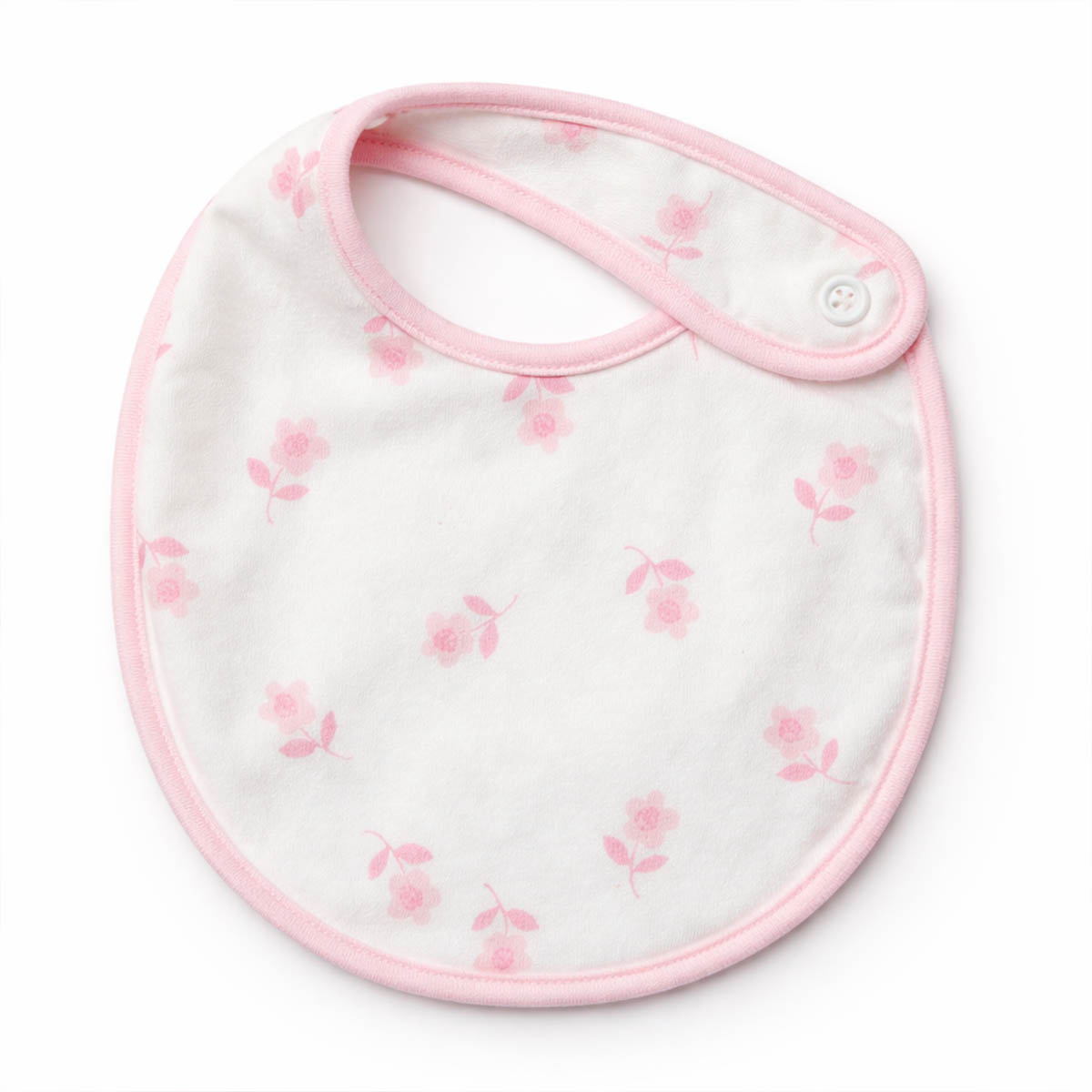 Pink floral baby bib designed to bring a soft, timeless charm to everyday feeding moments. Featuring a clean ivory base with delicate pink floral prints, this bib offers a gentle and calming look that feels perfect for newborns and young babies. The subtle flowers are evenly spaced, creating a light and elegant pattern that pairs beautifully with a wide range of baby outfits.