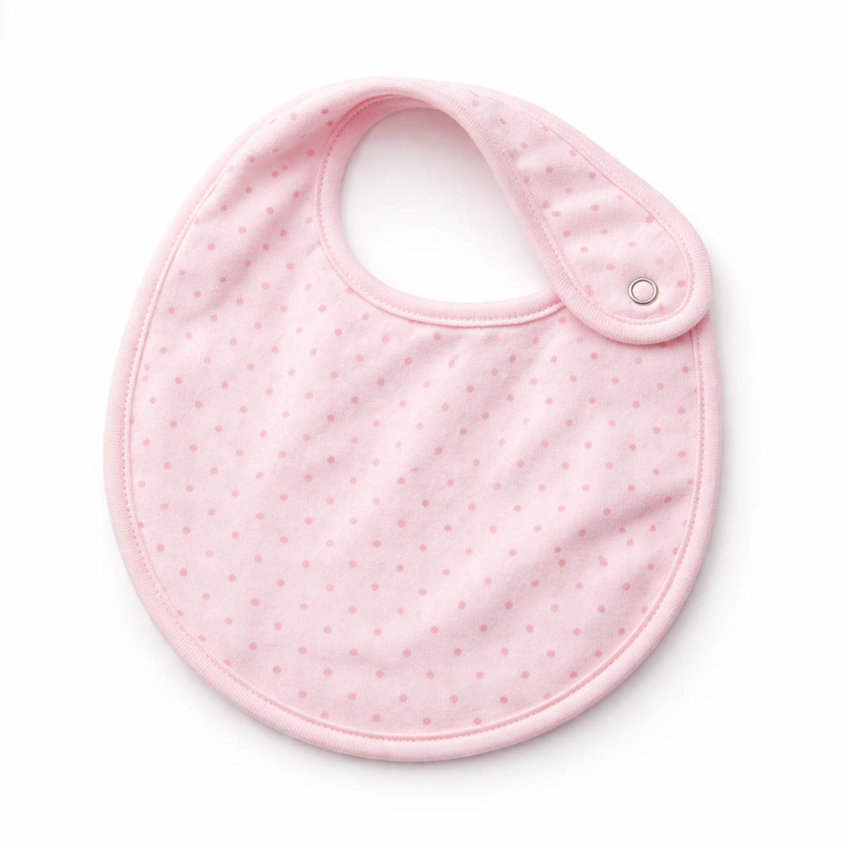 Designed for busy parents, this bib includes a secure snap closure at the shoulder for quick and fuss-free changes. The soft pink tone and subtle dot pattern give it a gentle, gender-soft appearance that works beautifully for everyday use. Whether at home, out for a walk, or visiting family, this bib blends seamlessly into daily routines.