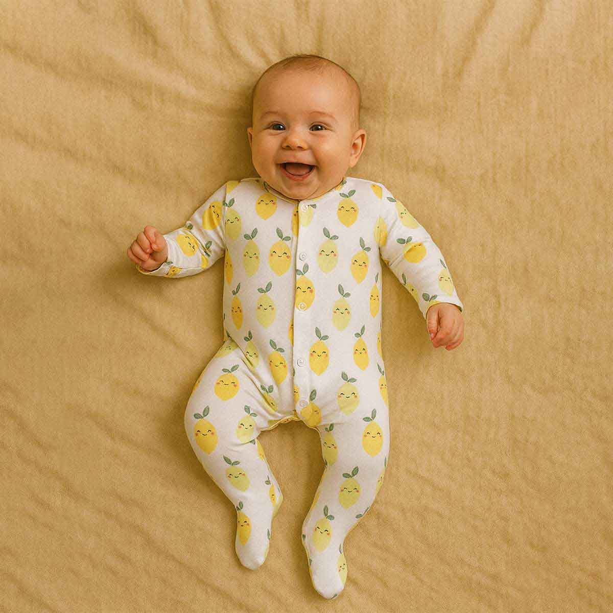 Fresh, playful, and full of sunshine, the Sunny Lemon Snuggles Sleepsuit brings a bright burst of joy to your baby’s everyday wear. Designed with an all-over smiling lemon print on a crisp white base, this sleepsuit feels light, cheerful, and perfect for little ones who love comfort with a fun, modern twist.