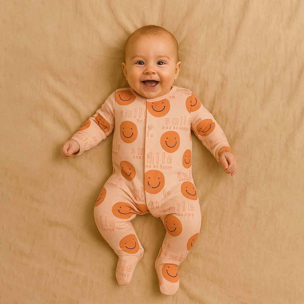 Bright, cheerful, and full of positivity, the Sunny Smiles Sleepsuit is designed to wrap your little one in comfort while spreading happy vibes. Featuring an all-over smiley face print with playful “smile and be happy” text on a soft peach-pink base, this sleepsuit brings a joyful, modern look to your baby’s everyday essentials.