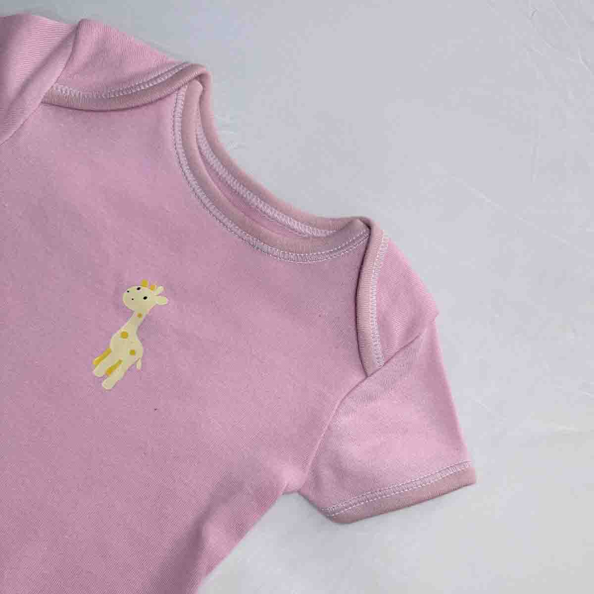 Soft, sweet, and effortlessly charming, the Tiny Giraffe Charm Baby Bodysuit is a delightful everyday essential designed to keep your little one comfortable while adding a gentle touch of playful style. Featuring a soft pink base with an adorable small giraffe print at the center, this bodysuit brings a calm, soothing look that’s perfect for daily wear, lounging, or outings.