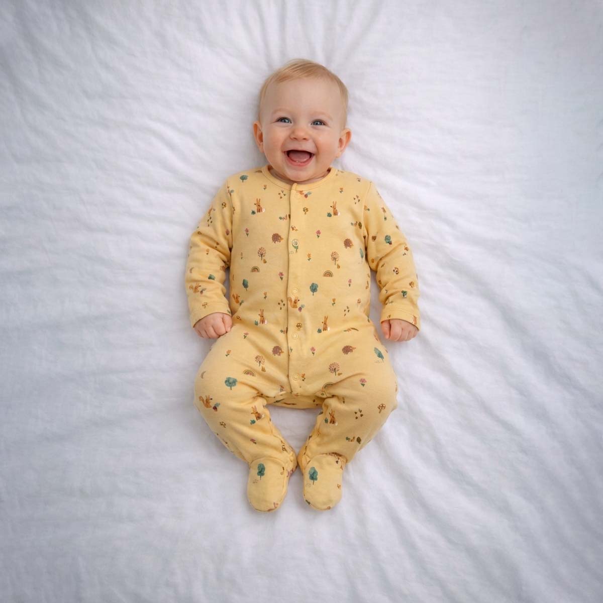 Woodland Print Baby Sleepsuit designed to bring storybook charm and cosy comfort to your little one’s everyday wardrobe. This delightful sleepsuit features a playful woodland-inspired print with sweet animals, trees, rainbows, and nature motifs scattered across a warm, golden-toned base. The gentle colours and whimsical illustrations create a cheerful yet calming look, making this woodland print baby sleepsuit perfect for both daytime wear and peaceful nights.